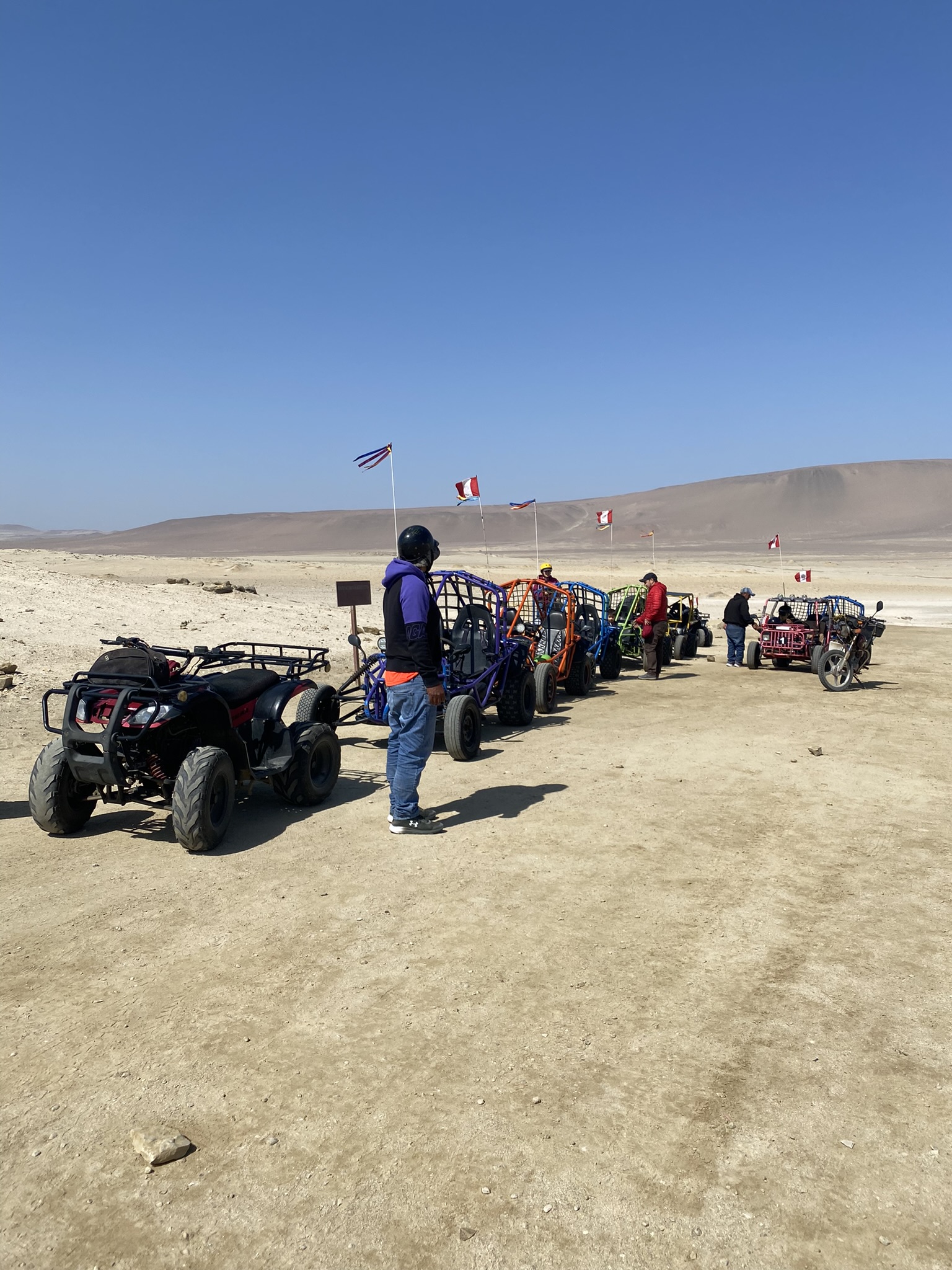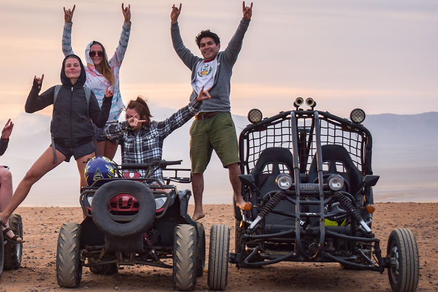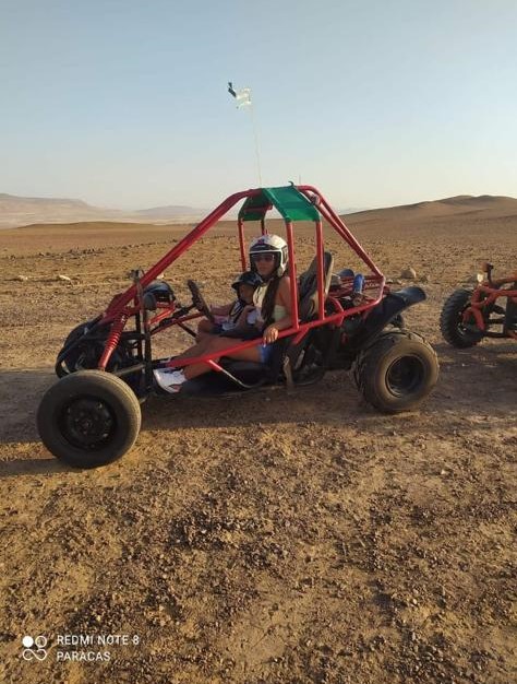 Continuaremos el tour con el circuito terrestre a la Reserva Nacional de Paracas en minibuggy, el recorrido dura 2 horas (mirador La Catedral, playa Yumaque, playa Supay, Punta Santa María y playa Roja (arenas de color rojo intenso); y son los mismos pasajeros quienes tienen que manejar los vehículos. Tener en cuenta que en el minibuggy ingresan dos personas.
